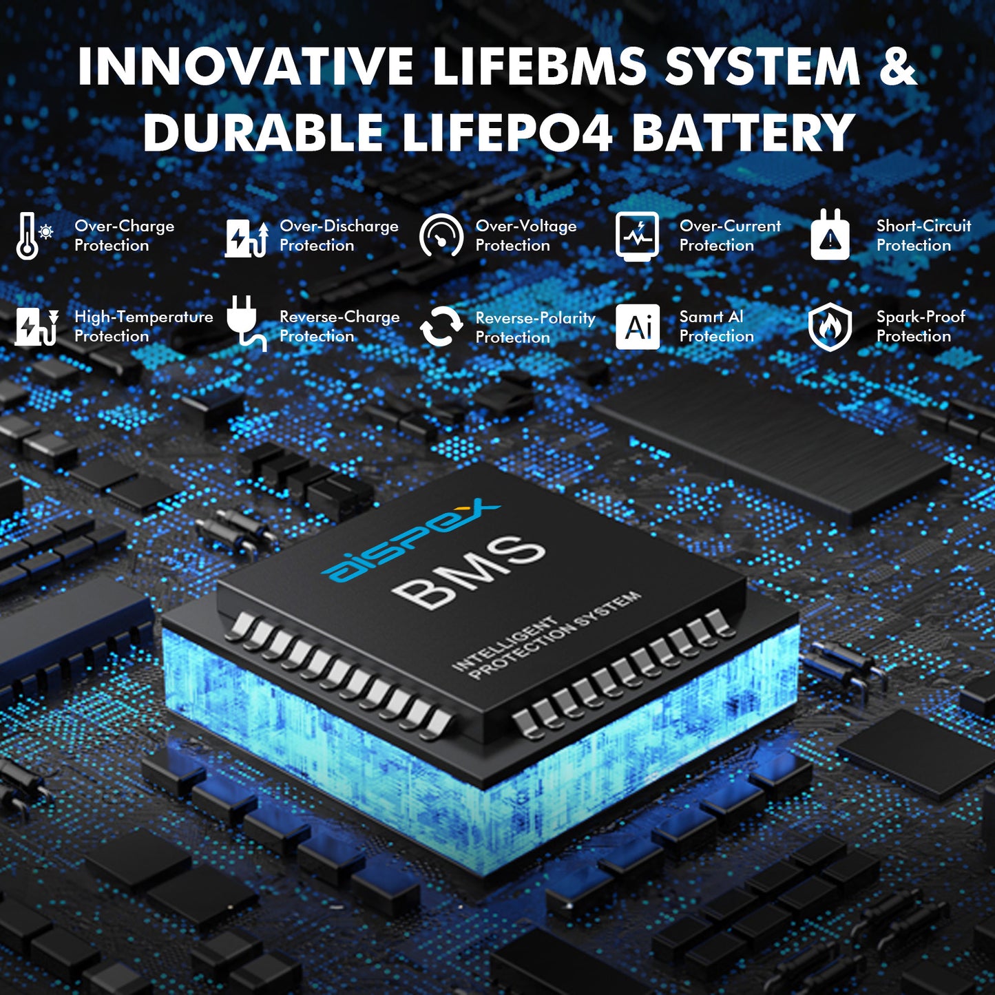 - Ultra Safe and Durable LFP Power Station: The AISPEX power station, equipped with a built-in super-safe BMS (Battery Management System), offers up to 10 battery protection to ensure safe charging.” This 640WH LiFePO4 (LFP) battery boasts an impressive lifespan, enduring up to 2,000+ full charge cycles before its capacity gradually reduces to 80% of the original.