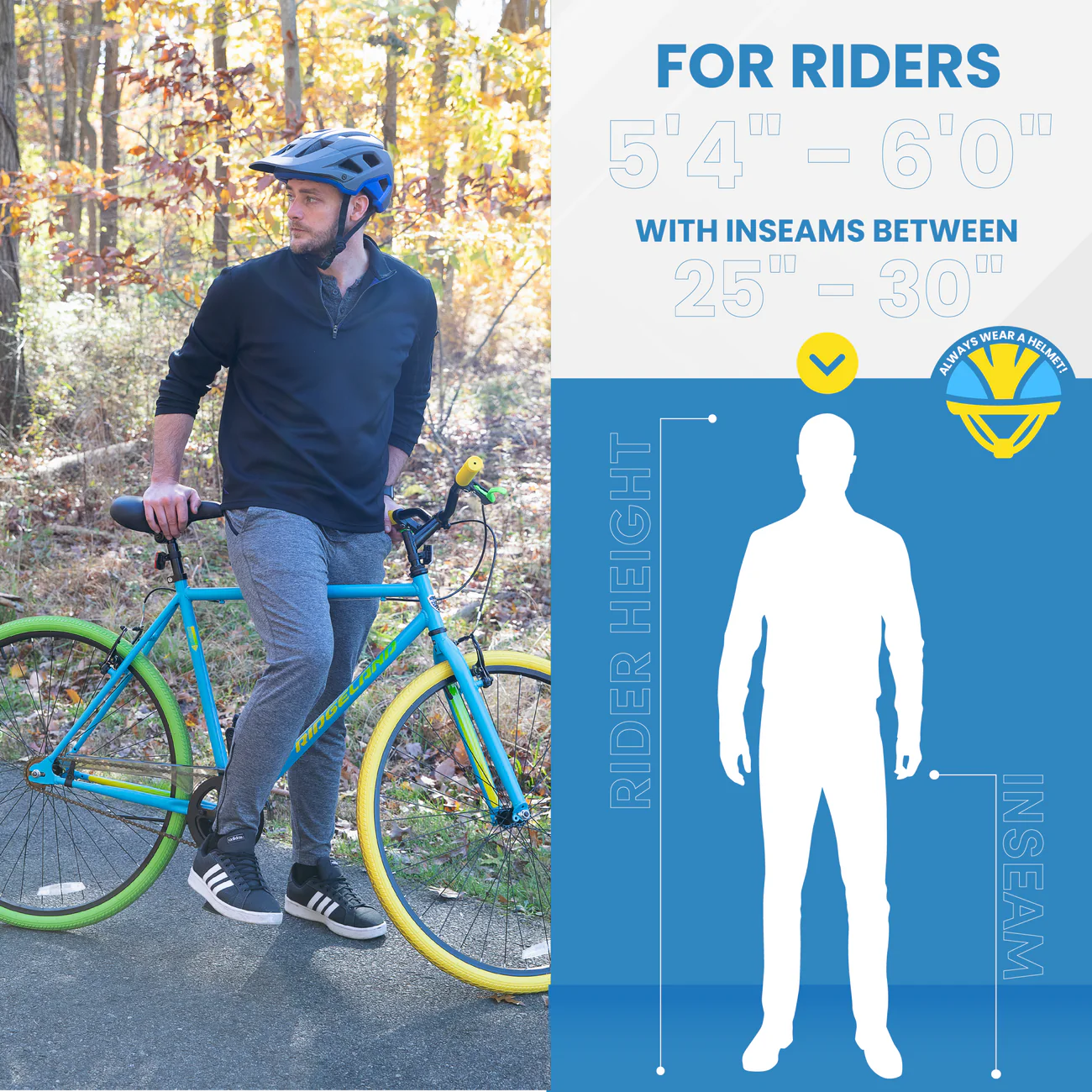 Looking for a reliable and practical commuter bike that will get you to your destination with ease? Look no further than the 700c Kent Ridgeland, the perfect choice for anyone who wants a simple and straightforward ride. Built with a durable tig welded steel frame and hi-tensile steel fork, the Kent Ridgeland is tough enough to handle the challenges of city streets and everyday use. And with its front and rear linear side pull brakes, you'll enjoy excellent stopping power and control, even in wet or slippery conditions. The single speed drivetrain is simple and efficient, making it easy to get up to speed and maintain a comfortable pace on your commute. And with lightweight alloy wheels and 700c road tires, the Kent Ridgeland is both responsive and nimble, perfect for navigating through traffic or on long rides. But the Kent Ridgeland isn't just practical and functional. With its colorful mismatched style, this bike is eye-catching, making it the perfect choice for anyone who wants a bike that looks as good as it rides. Experience the perfect blend of simplicity, style, and performance!