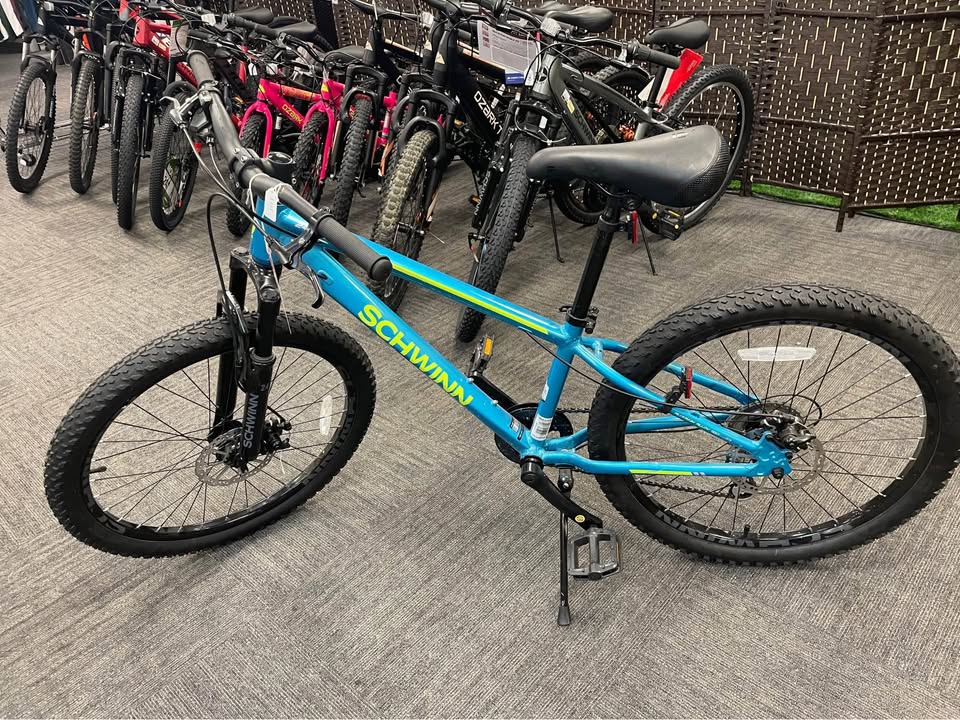 • Kids' mountain bike featuring a lightweight Schwinn aluminum frame, great for rugged trails and casual rides. 24-inch wheels fit riders between 4'4" and 4'9" tall. Unisex.
