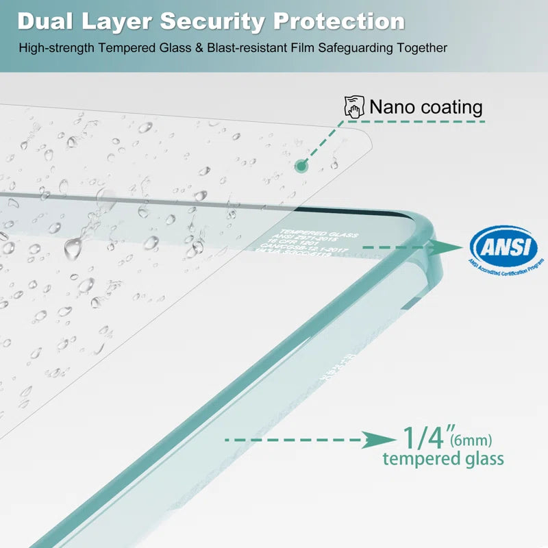 - DUAL LAYER SECURITY PROTECTION---ANSI certified 1/4"(6mm) thickness clear tempered glass tub door with blast- resistant film safeguarding resists streaks, shards, and dangerous breakage to ensure long-lasting beauty.