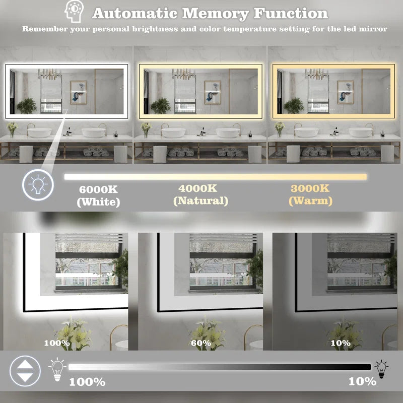 - Dimmable & Humanized - This brightness of front-lit and backlit can be dimmable. You can long-press the touch-sensor switch to adjust the brightness from 10% to 100%, to your comfort level. Also, the color temperature can be changed among warm light (3000K) / Natural light (4000K) / white light (6000K) for versatile needs. The smart memory function will record the lighting setting and keep the previous lighting status after turning it off and on. When the function is on, the screen button is in white, when the function is off, it will be in color blue.