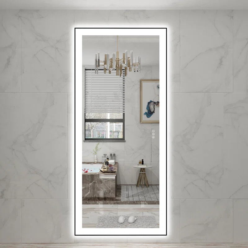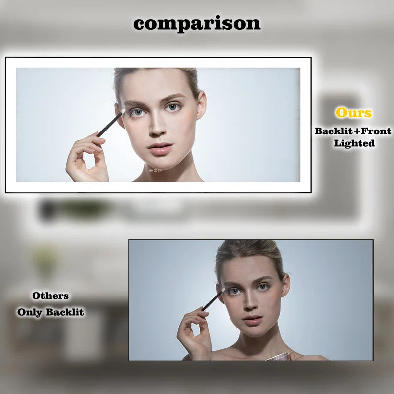 - Super Bright - Double lighting sources, Super Bright. This Illuminated mirror has built-in double premium energy-saving LED light strips and lights up from the front surface and the backside. To make the mirror bright enough for you to do makeup, shave, beauty care, and dress up. Each light strip has 192 pcs of LED beads per meter and lasts up to 50,000 hours. No dark, no shadow, super clear, super bright.