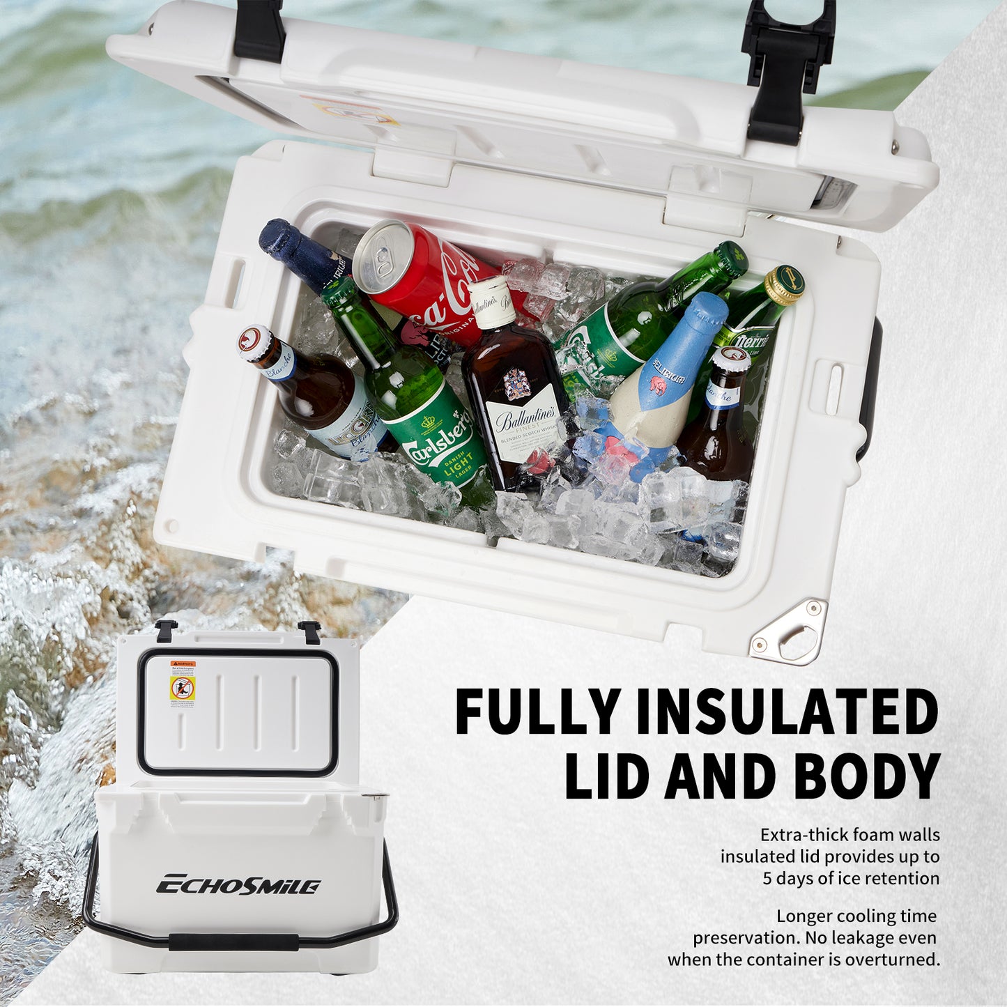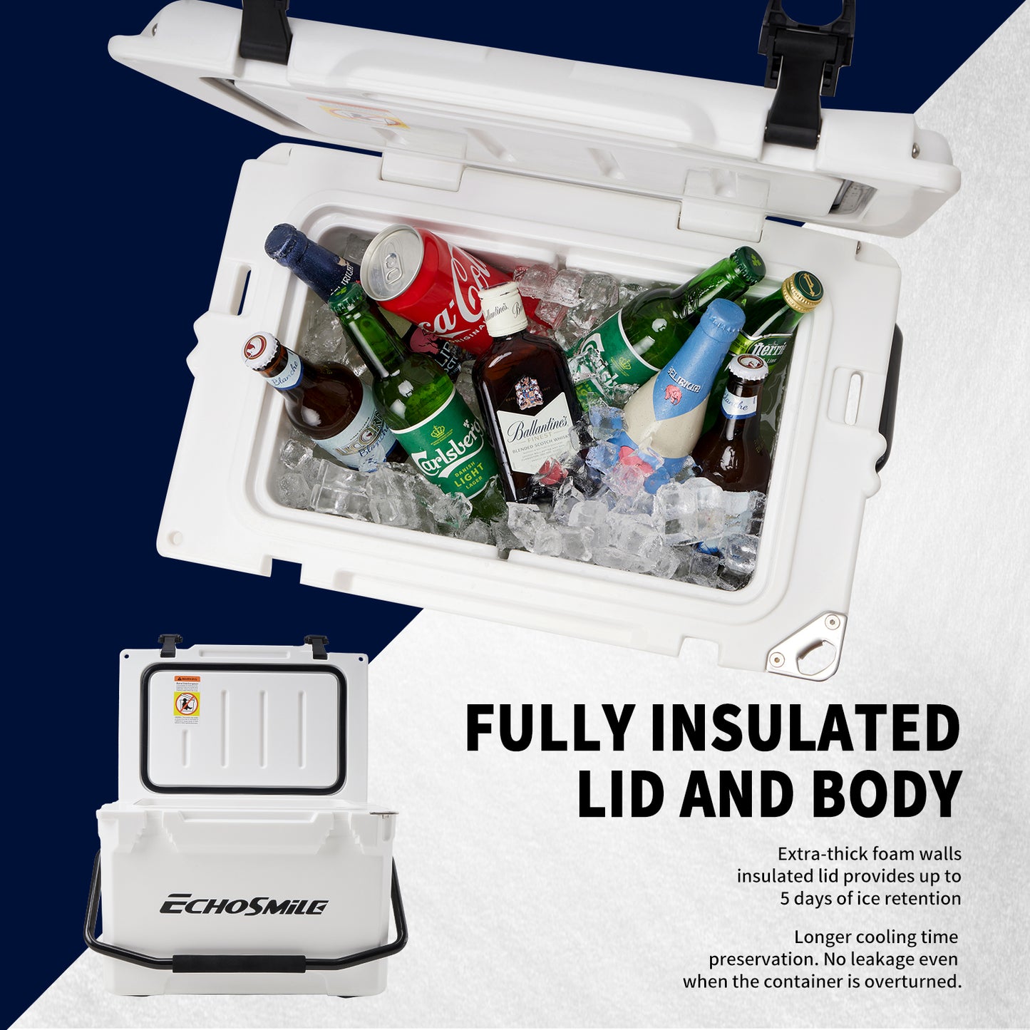 ① ICE RETENTION: EchoSmile Rotomolded cooler keeps cold for up to 5 days with recommended 2:1 ice-to-contents. The intermediate insulation layer is made of polyurethane so as to provide superior insulative and high strength. The silicone sealing ring seals the whole space to avoid heat convection and prolong the cryopreservation time.