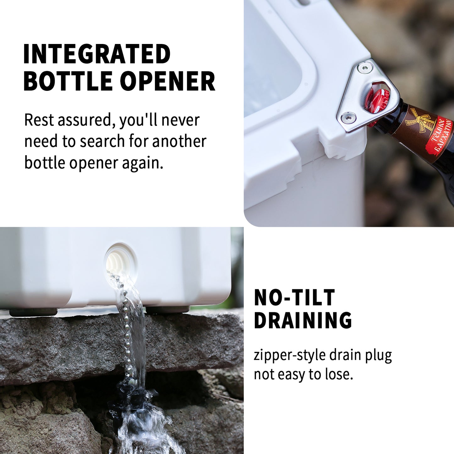 Our rotomolded cooler's rugged design doubles as an additional seat or sturdy table.It can support up to 350 lbs, adding versatility to your outdoor experiences.Attached with a handy chain, the drain plug cap is always within reach when it's time to drain the cooler. Enjoy effortless cleanup after your journeys.