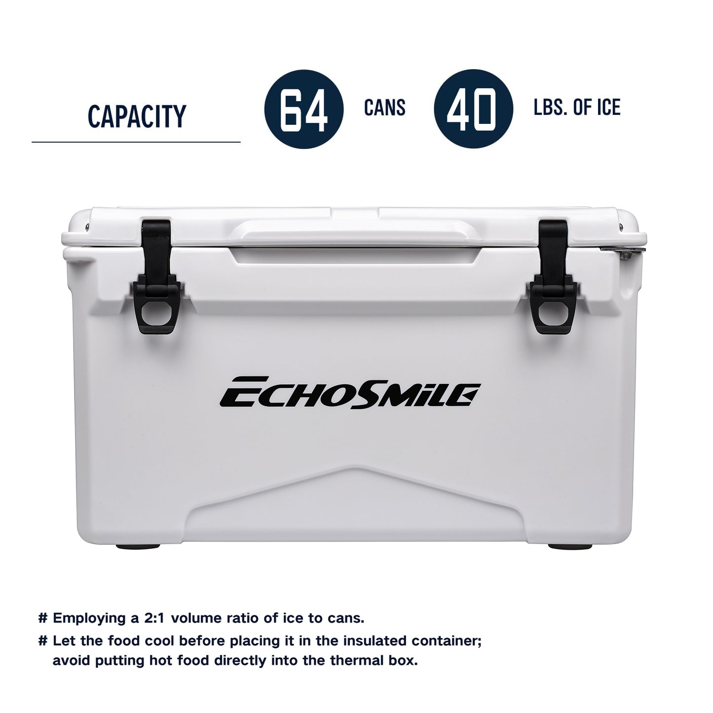 ① ICE RETENTION: EchoSmile Rotomolded cooler keeps cold for up to 5 days with recommended 2:1 ice-to-contents. The intermediate insulation layer is made of polyurethane so as to provide superior insulative and high strength. The silicone sealing ring seals the whole space to avoid heat convection and prolong the cryopreservation time.