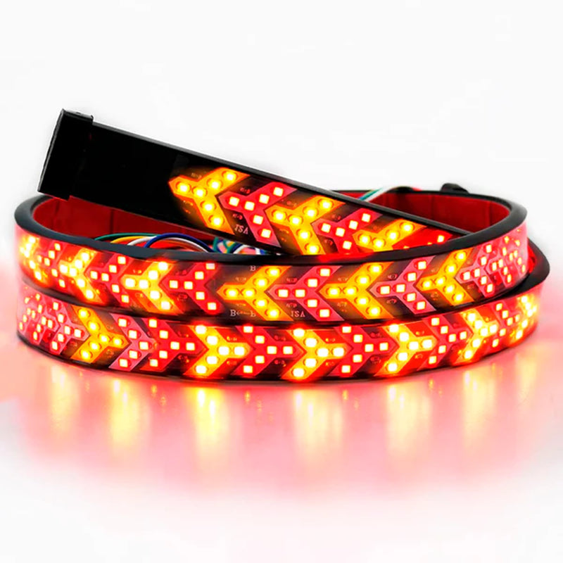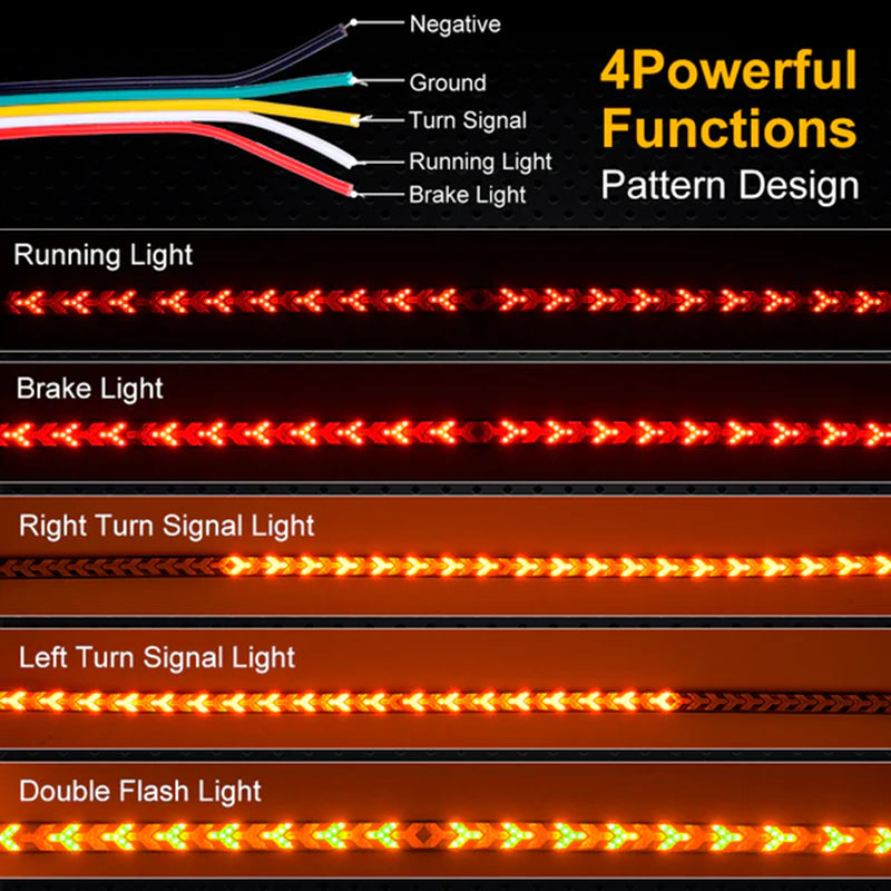 ●Super Bright Tailgate Light Bar: LED Truck Tailgate Light Bar combining horizontal turn and arrow pattern turn signal light, show an ultra-bright lighting and more eye-catching patterns to improve visibility and safety.