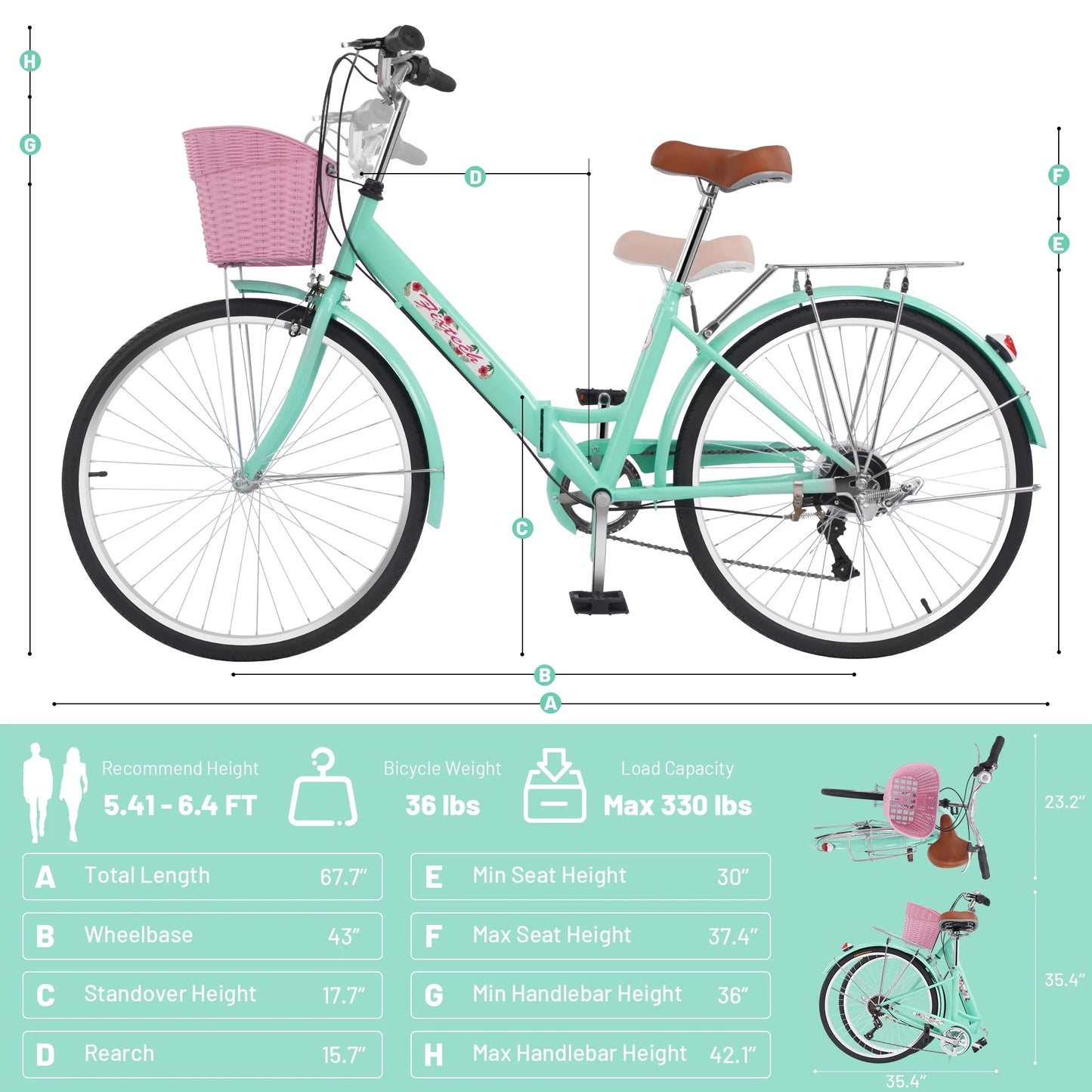 refurbish Fixtech 26'' 7 Speed Folding Women's Bike, Cruiser Bike with Basket and Rear Rack, Vintage Green