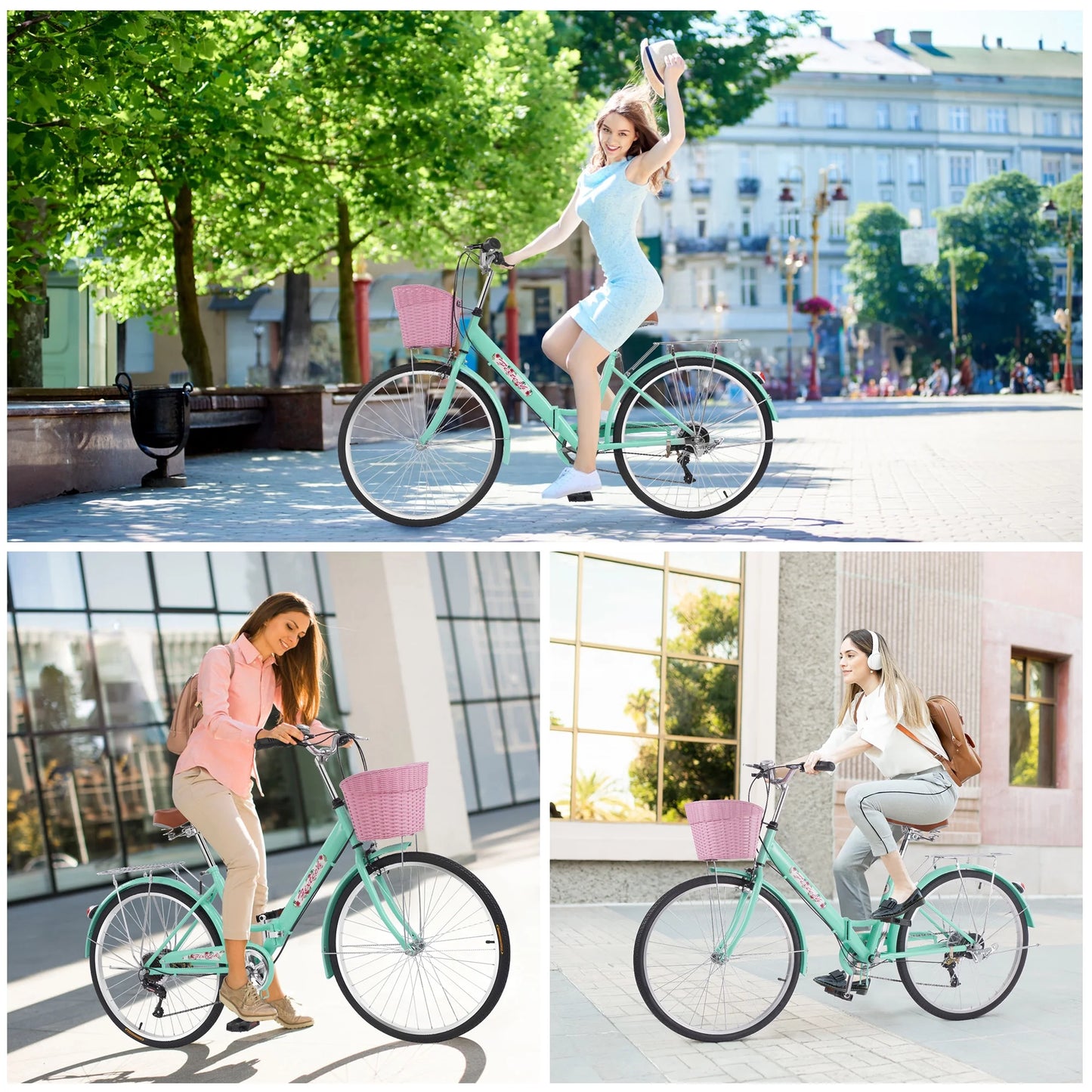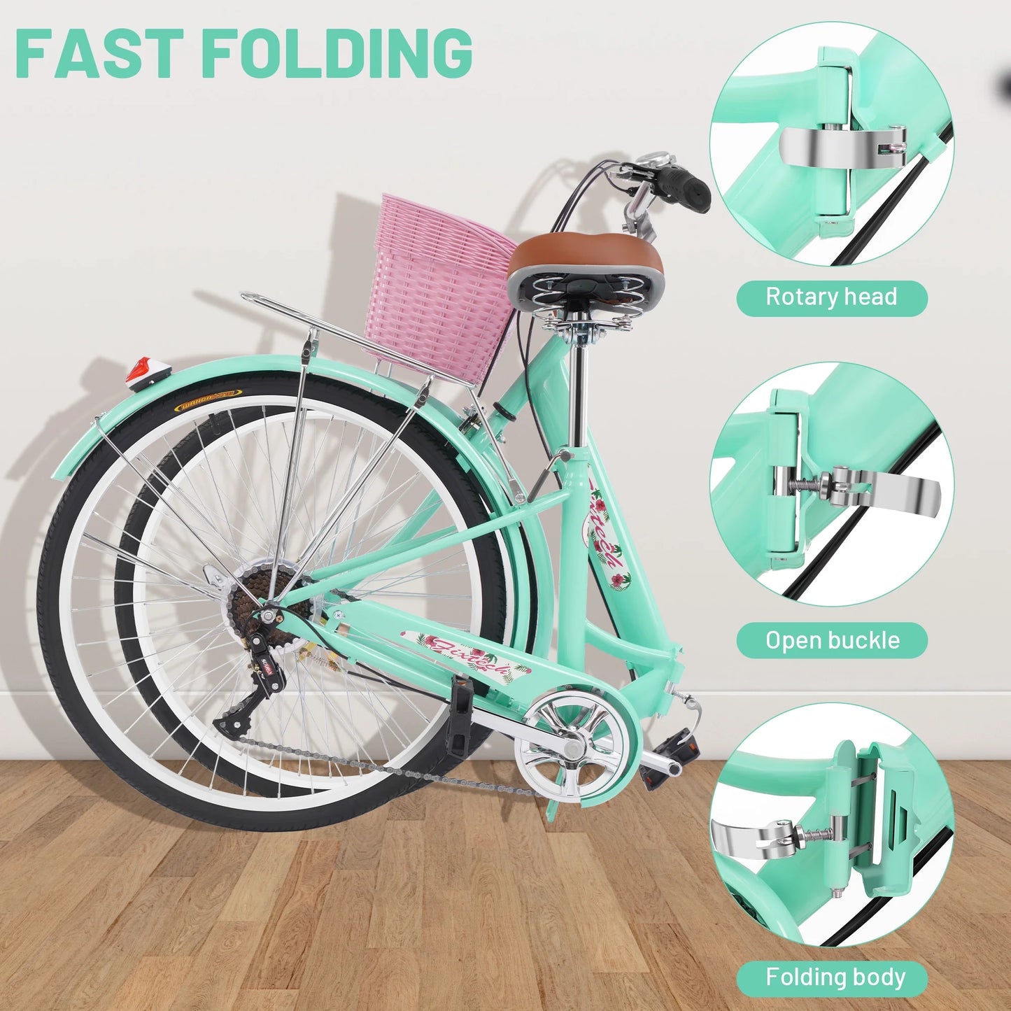 Fixtech 26'' 7 Speed Folding Women's Bike, Cruiser Bike with Basket and Rear Rack, Vintage Green